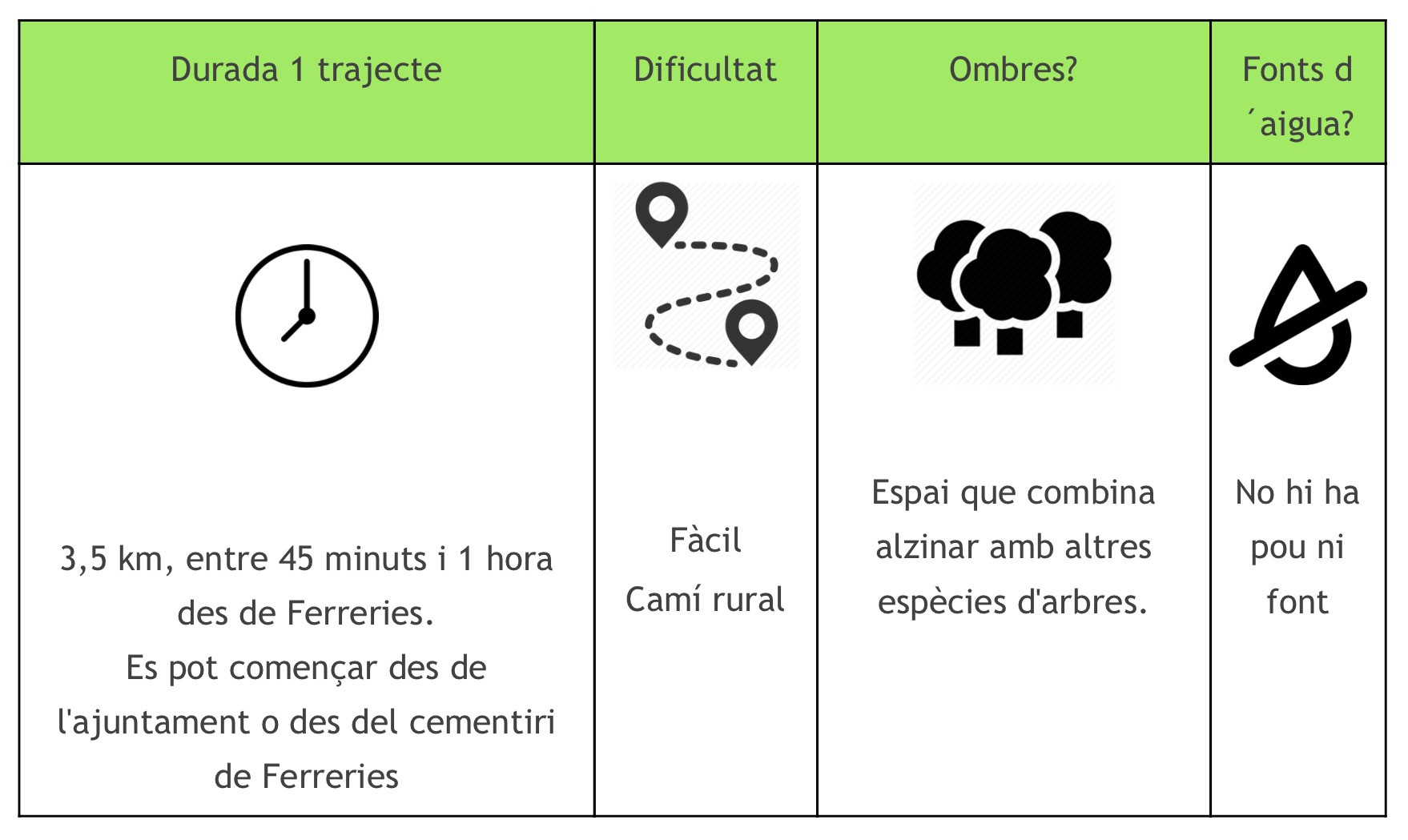 El tram de Ferreries va ser feliçment recuperat durant els anys 90 gràcies a l’entusiasme d’un grup de joves de la Creu Roja de Ferreries, que van dedicar molts esforços a deixar-lo ben net i aclarit, a senyalitzar-lo i a conèixer i divulgar el seu vessant històric.