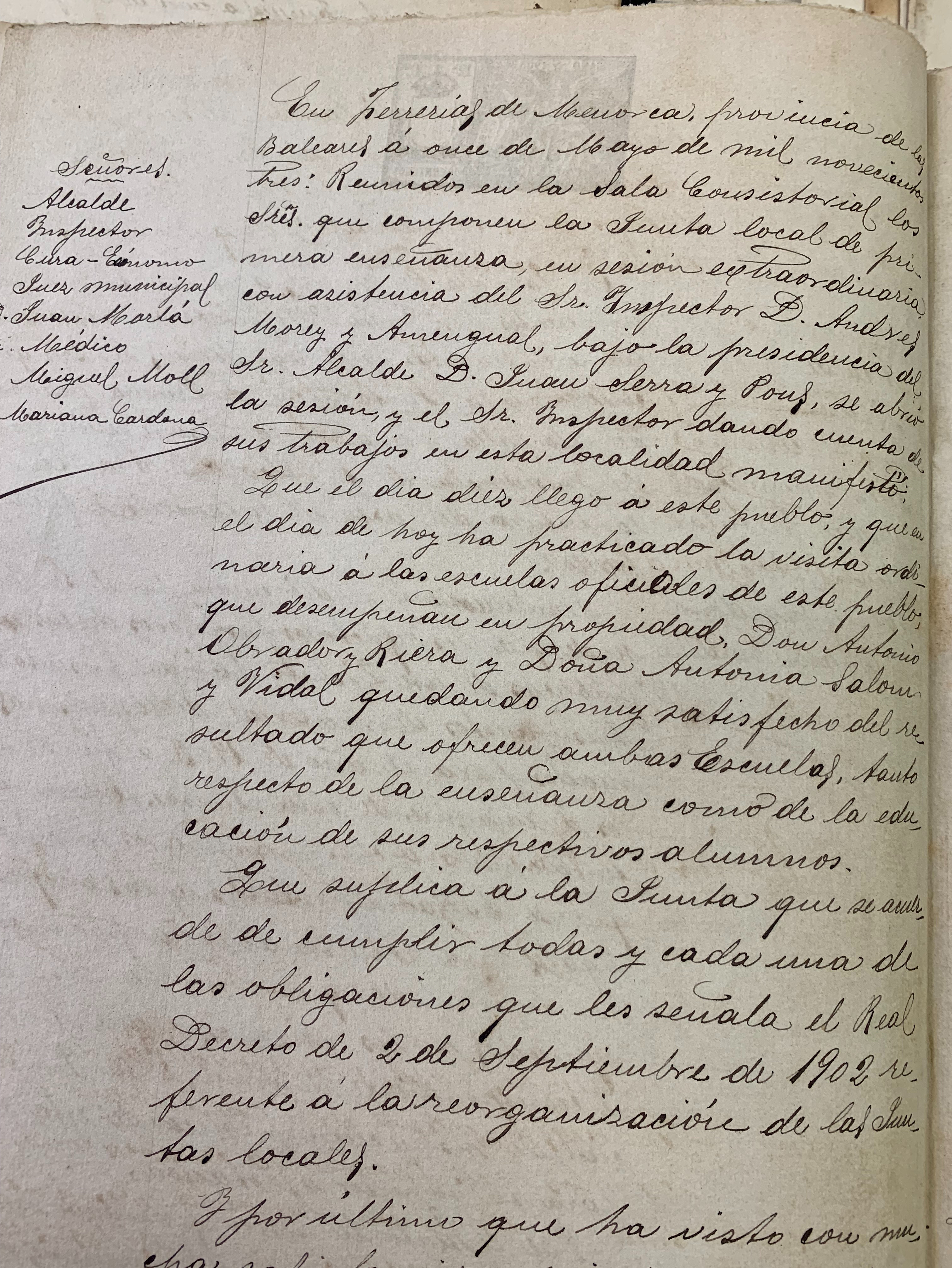 “Hoy se ha celebrado la fiesta tal como dice el programa; diana por la Banda y capsgrossos, dando la vuelta al pueblo. Misa con tadeo (Te Deum) y seguidamente con la banda casi todo el pueblo y autoridades han ido a bendecir las tres calles nuevas con los siguientes nombres: Virgen de Monte Toro, Calle Reverendo Sr. Huguet y Calle del Maestro obrador. En el momento de estos actos, y principalmente en la calle del Maestro Obrador, estaba presente su hijo Lelio, quien llegó estos días de Palma con su mujer…”